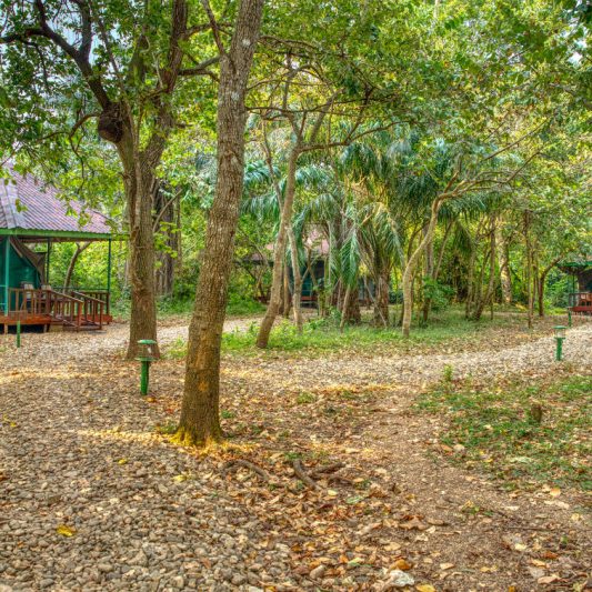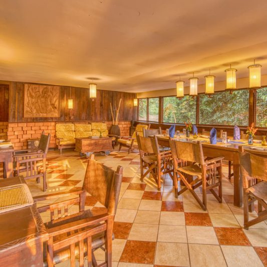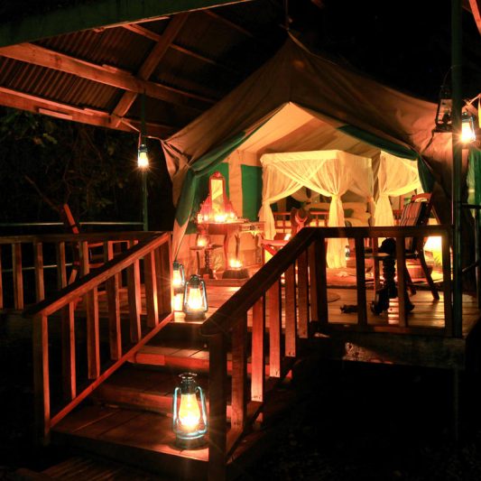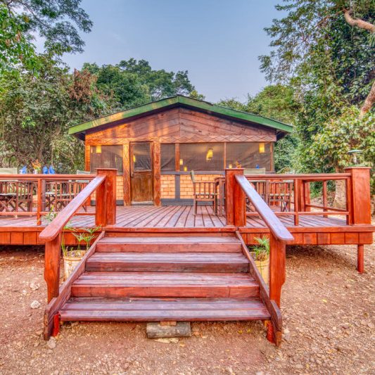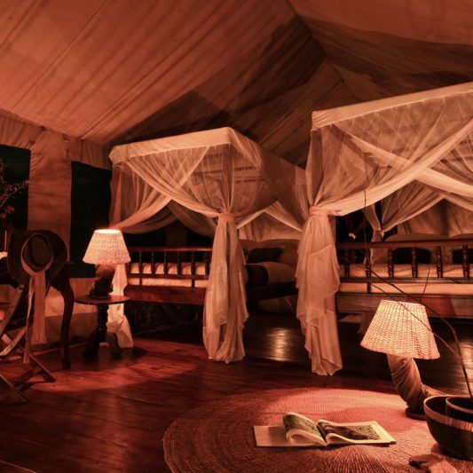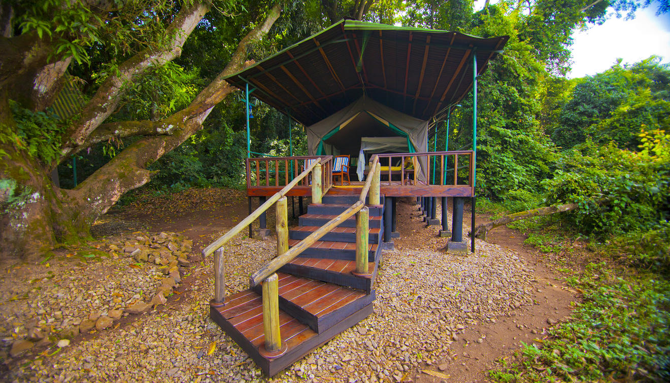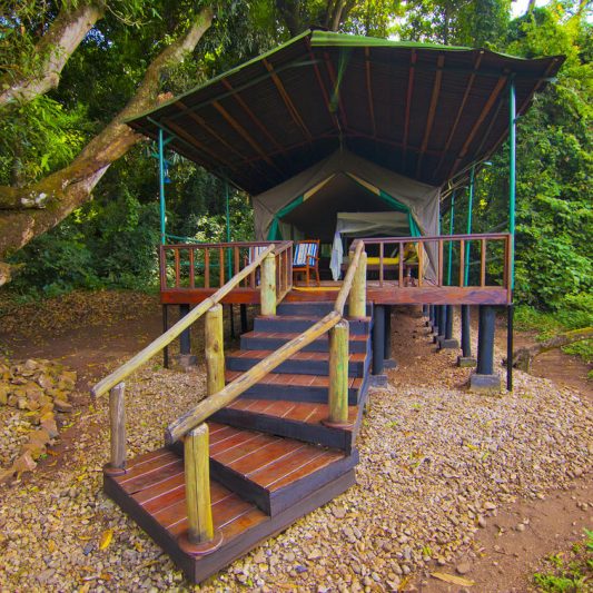 Accommodation is arranged in spacious safari tents that focus on comfort and simplicity. Each tent is raised on a timber platform and includes a private deck looking out toward the forest, offering a calm space to sit and listen to the sounds of the trees. The tents are thoughtfully positioned beneath large mango trees near the main lodge, helping keep the environment shaded and minimizing impact on this delicate setting. Inside, you’ll find practical touches such as a writing desk and chair, along with en-suite facilities and a shower, making the stay comfortable while still keeping the experience close to nature.