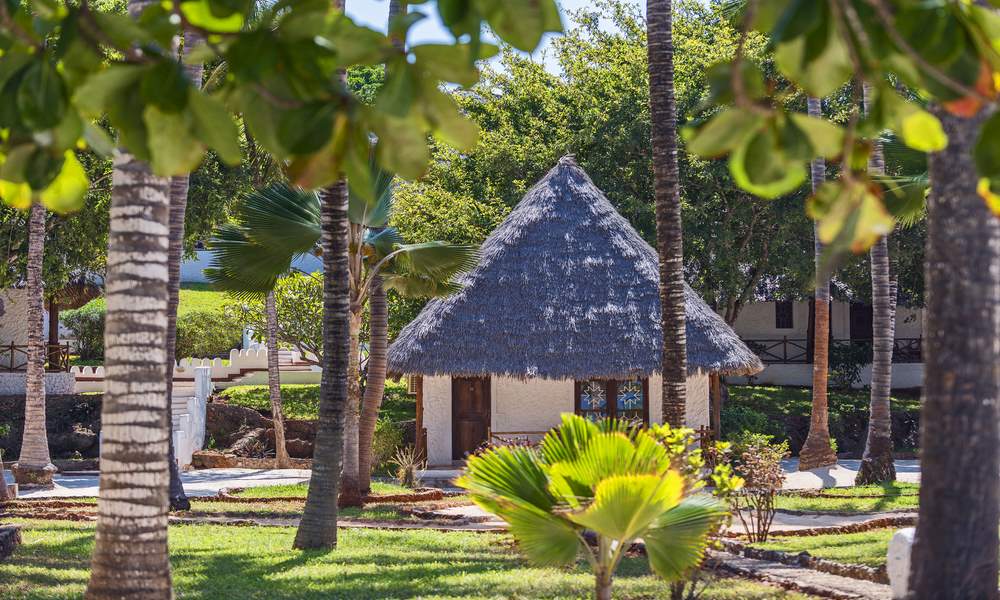 The resort is located roughly forty to forty-five kilometers from both Stone Town and the airport, making it a convenient choice for travelers who want to settle into a beach stay without being too far from Zanzibar’s cultural highlights. The setting is very much a garden-and-ocean experience, with pathways through lush greenery leading toward the shoreline and the soft blues and greens of the water beyond. Days here can be as relaxed as you want, whether that means stretching out on a sunbed near the beach, enjoying time by the pool, or simply taking in the view and letting the island do what it does best: slow everything down.