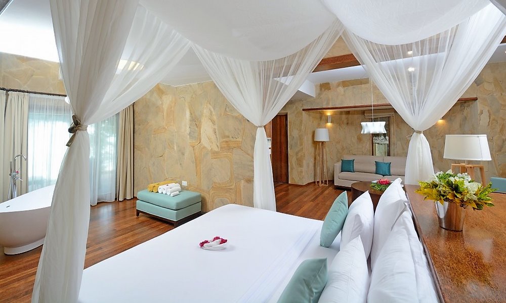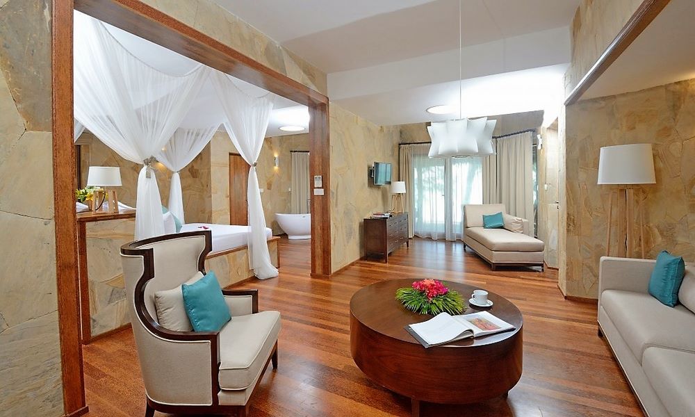 For travelers seeking the highest level of privacy within the resort, the Royal Villa with Jacuzzi is designed as a luxurious hideaway. It is set to overlook the gardens and palm grove and is built for quiet comfort, with a private Jacuzzi and an outdoor seating area that makes evenings feel especially relaxing. Large doors open the space toward the outdoors, creating a natural connection to the garden while maintaining that sense of seclusion. The design combines African wood and stone and features a traditional open thatch roof, giving the villa a character that feels both modern and rooted in the island’s atmosphere. The Royal Villa offers approximately 160 m² of living space with about 150 m² garden area, making it a beautiful option for honeymooners or guests celebrating something special.